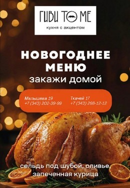 Ресторан «Гиви to me (ту ми)» приглашает жителей и гостей города Екатеринбурга полакомиться настоящей грузинской кухней. Сюда вы можете придти в обеденное время на бизнес-ланч с деловым партнером или на уютный семейный ужин. Это также отличное место, чтобы устроить свидание для своей второй половинки, отметить день рождения с друзьями, организовать мини-банкет для коллег или весёлый праздник для детишек.